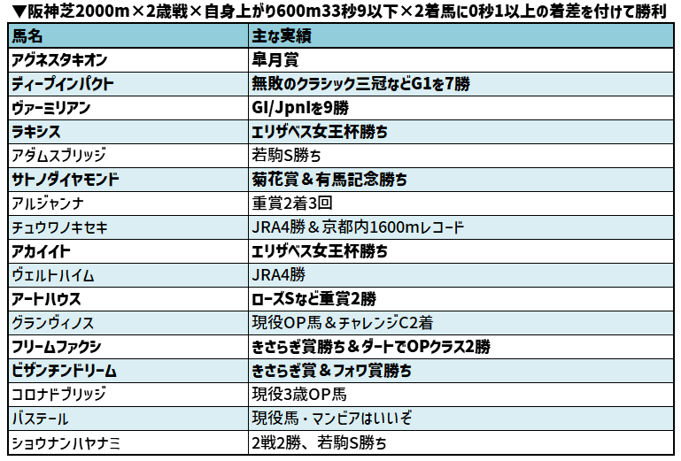 14分の6でGI馬、14分の9で重賞勝ち馬になる特注ラップパターンを新馬でマークしたうえ、2戦目は出遅れて外回して加速ラップでブチ抜いたわけなのでシンプルに重賞級でしょう。