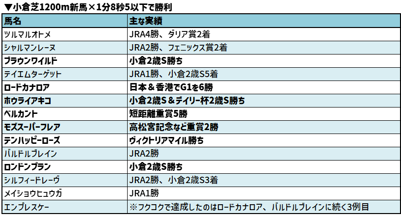 噂の大物外国産馬が持ったままで大楽勝。ちなみに小倉芝1200mの新馬戦を1分8秒5以下で制した馬は過去こんな感じ。